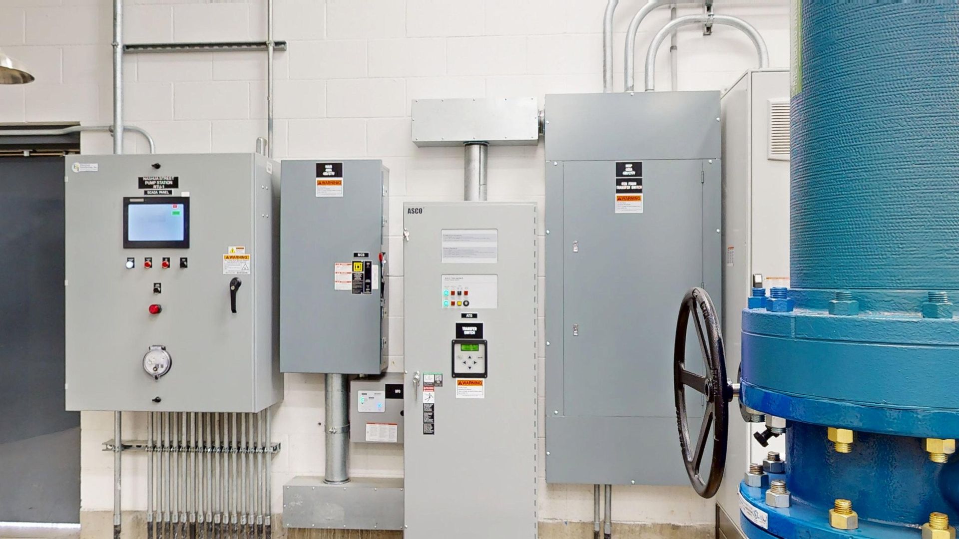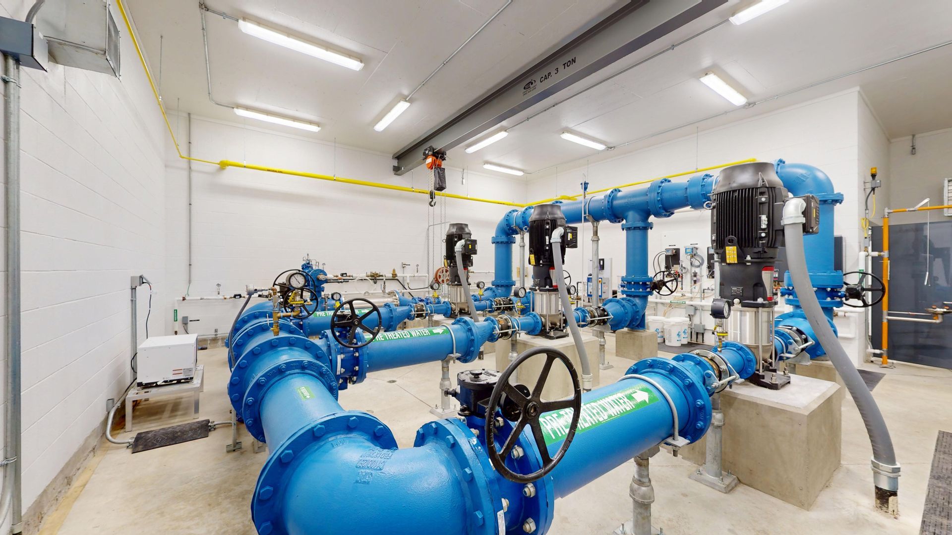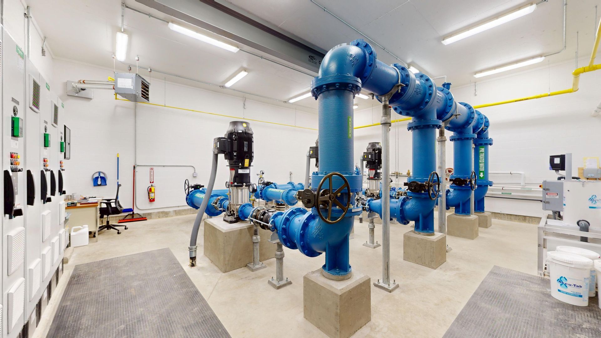 - All Pumps and chemical Feed Systems are controlled through Variable Frequency Drives ( VFD’s ) integrated with a SCADA System incorporating adjustable pressure and flow setpoints, water tank levels, and related alarms all with adjustable time delays and ability to contact Water Department personnel in case of emergency.