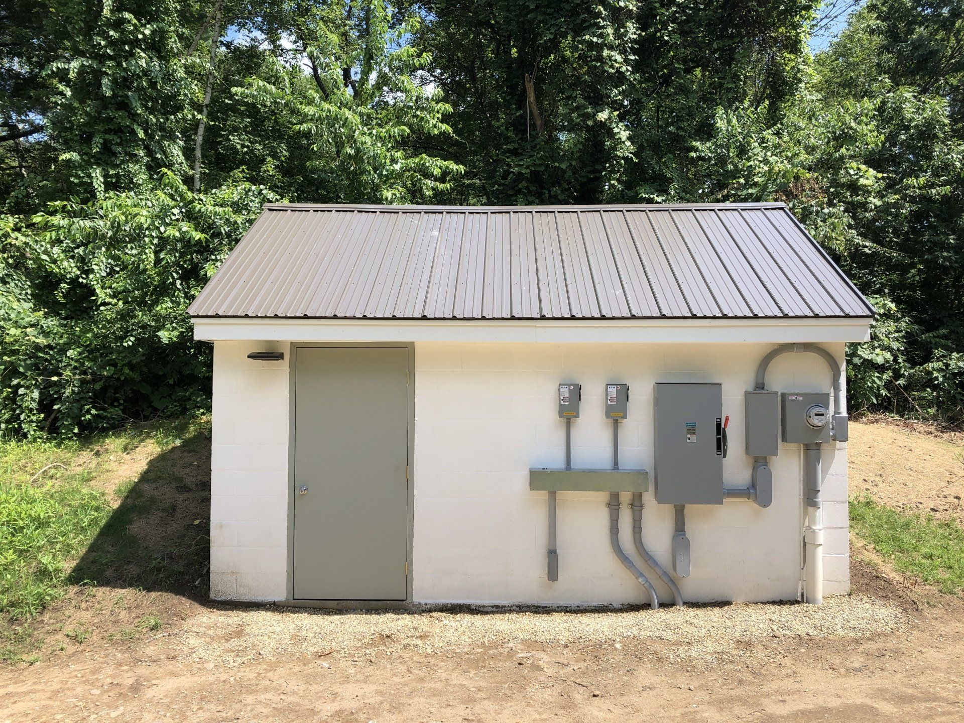 The Bedford NH Pump Station is a Booster Station that provides Water for domestic use, irrigation and Fire Protection for a new development. HAWSCO performed all work from the Foundation up for a 22’ x 24’ CMU Building that is strapped and sided with Vinyl Siding, new 208 VAC Electric Service, a full HVAC System, REPCO Control System with full Instrumentation and Controls, and a 100 KW Natural Gas Generator.